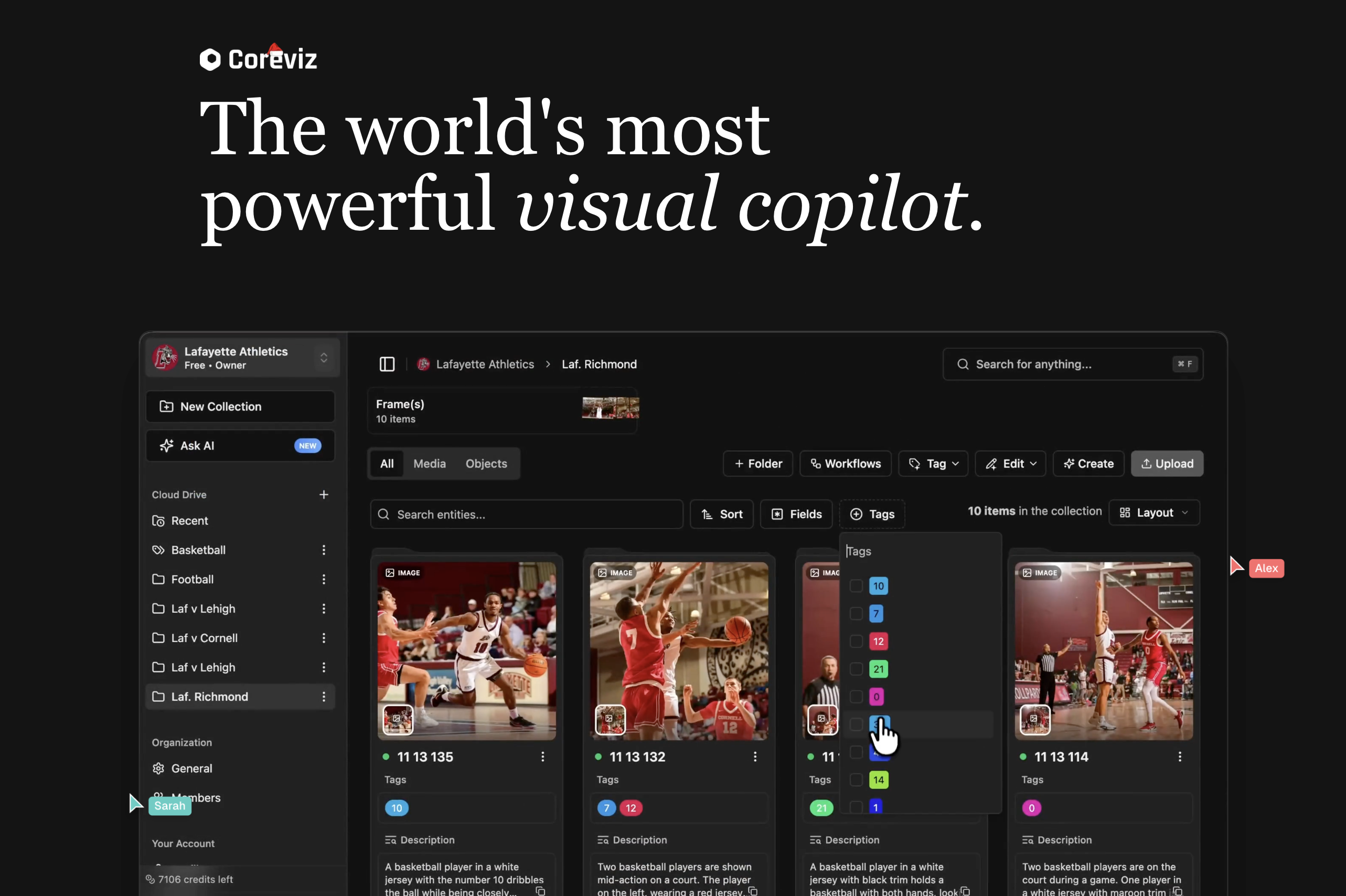 Coreviz is a new kind of media workspace helping teams organize, search, tag, edit and analyze their image and video datasets using advanced AI.